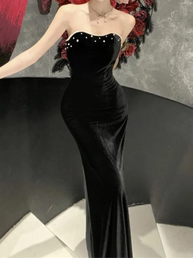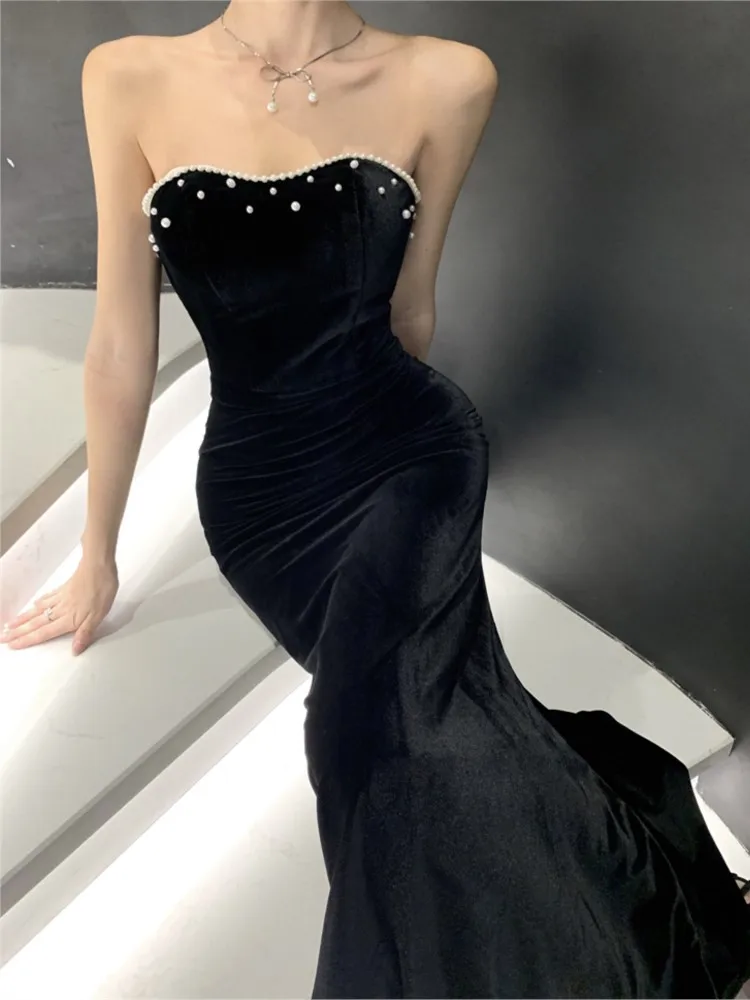Fabric choice plays a crucial role in the overall effect: a satin black dress provides smooth structure and a polished shine, while a velvet black gown adds depth and richness. For a more intricate or modern aesthetic, lace black dresses or mesh overlay black gowns introduce texture and dimension, elevating the mermaid silhouette with subtle sophistication.