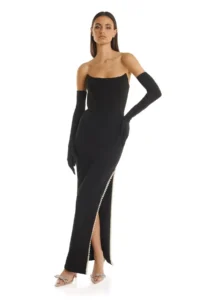 Accessorizing a strapless black prom dress requires balance and focus on key features. Statement jewelry such as chandelier earrings or a delicate necklace highlights the neckline, while a clutch bag adds functionality and sophistication. Elegant shoes—matching heels or strappy sandals—complete the ensemble, ensuring a cohesive, polished look. Subtle hair styling, like updos or soft curls, complements the strapless design without competing with it.
